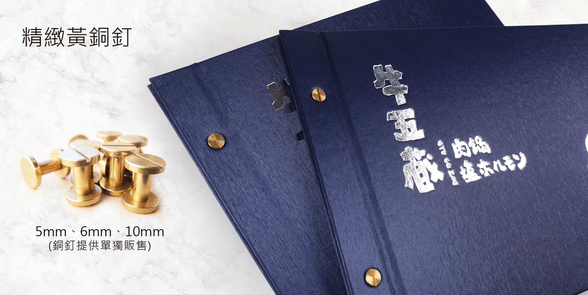 ▼銅釘拆卸好便利。菜單工場會依照菜單設計的內頁多寡,採用不同尺寸的銅釘。
