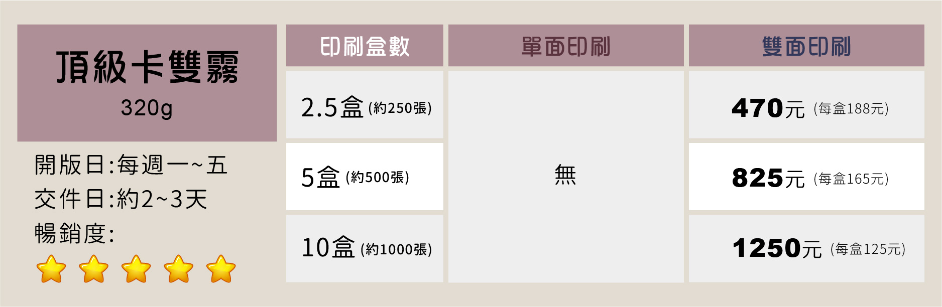 紙張霧面不反光處理,使油墨呈現色彩會較暗,請特別注意。印刷色彩表現沉穩典雅大方,且上膜後即使重墨色、滿版色塊的設計,也不會有背印的問題。
