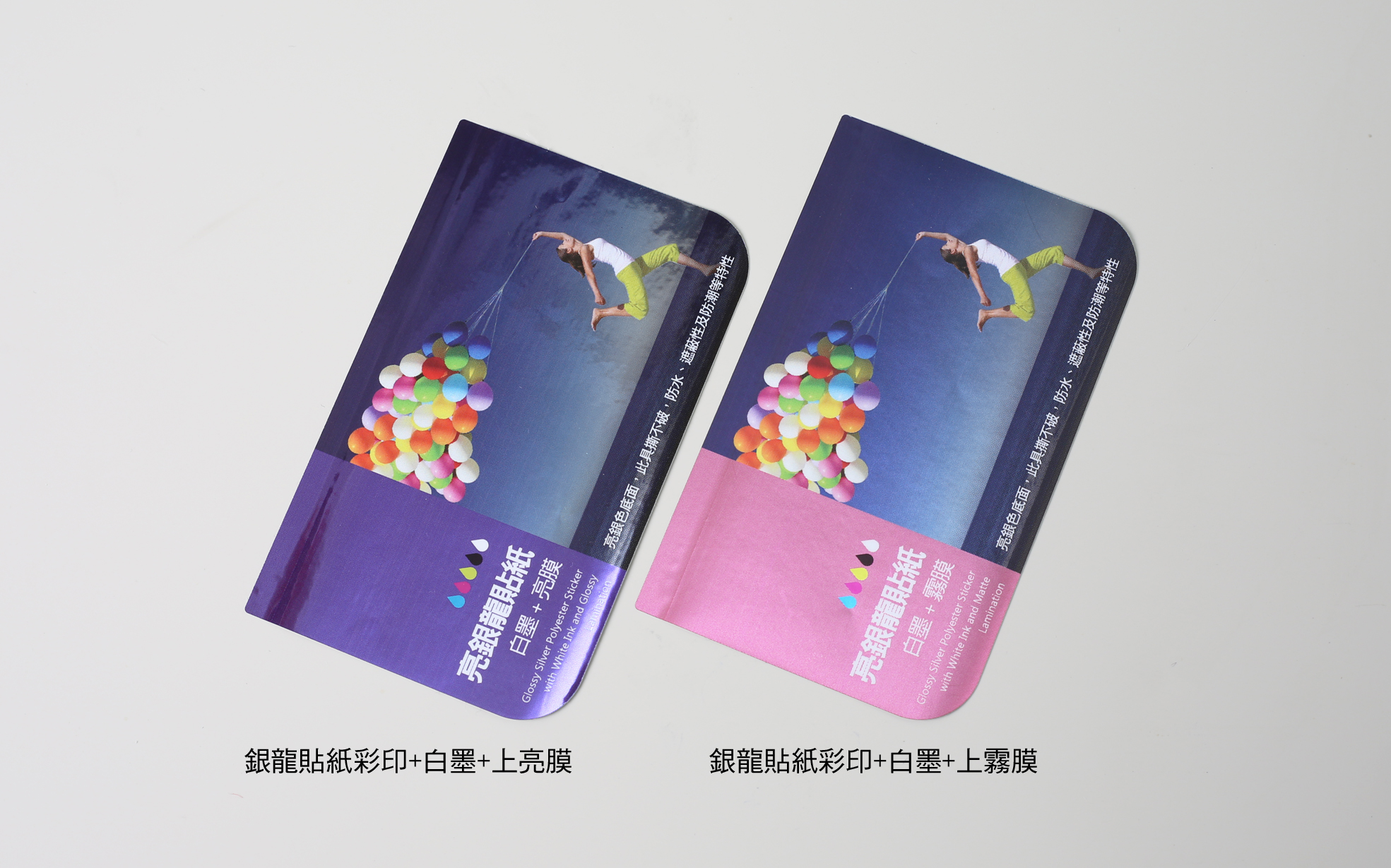 如要在銀色特多龍貼色上印刷鮮豔色彩,需先印白墨,再疊印色彩至白墨上,才能使色彩亮麗飽和。另可再加上亮膜或霧膜來保護印刷面及增加耐用性。