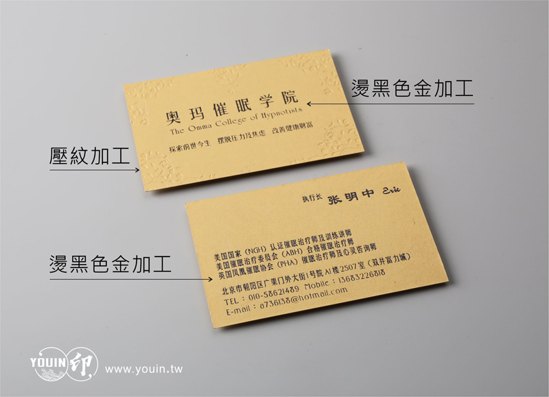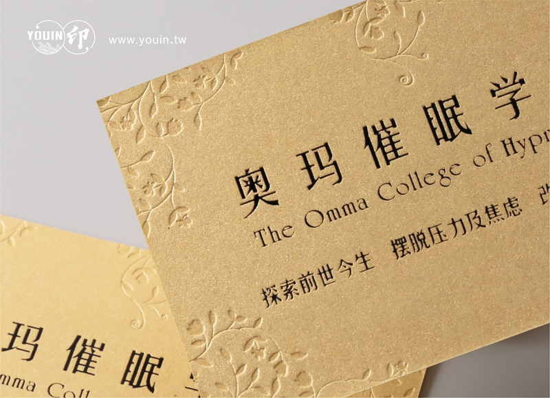 燙金又分為「有色燙」、「無色燙」,無色燙名片又稱打凹名片、壓紋名片、烙印名片。因為與燙金同樣使用鋅版(或者鎂版、銅版、樹脂版)等燙金版,差別只在於是否印上色箔而得名。